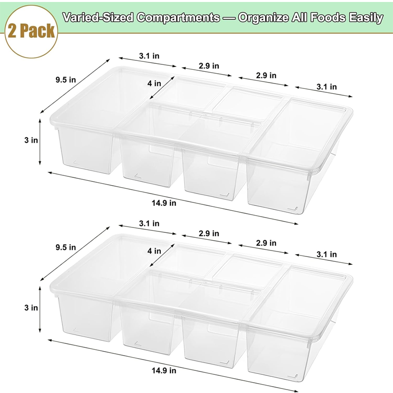 Our refrigerator storage box is made of durable, food-grade material. The lidded design provides sealed preservation, and the 5 compartments allow for categorized storage of different foods. It effectively prevents contamination and dust, making it ideal for storing various ingredients in the refrigerator and keeping your food fresh. No intellectual property rights are involved.